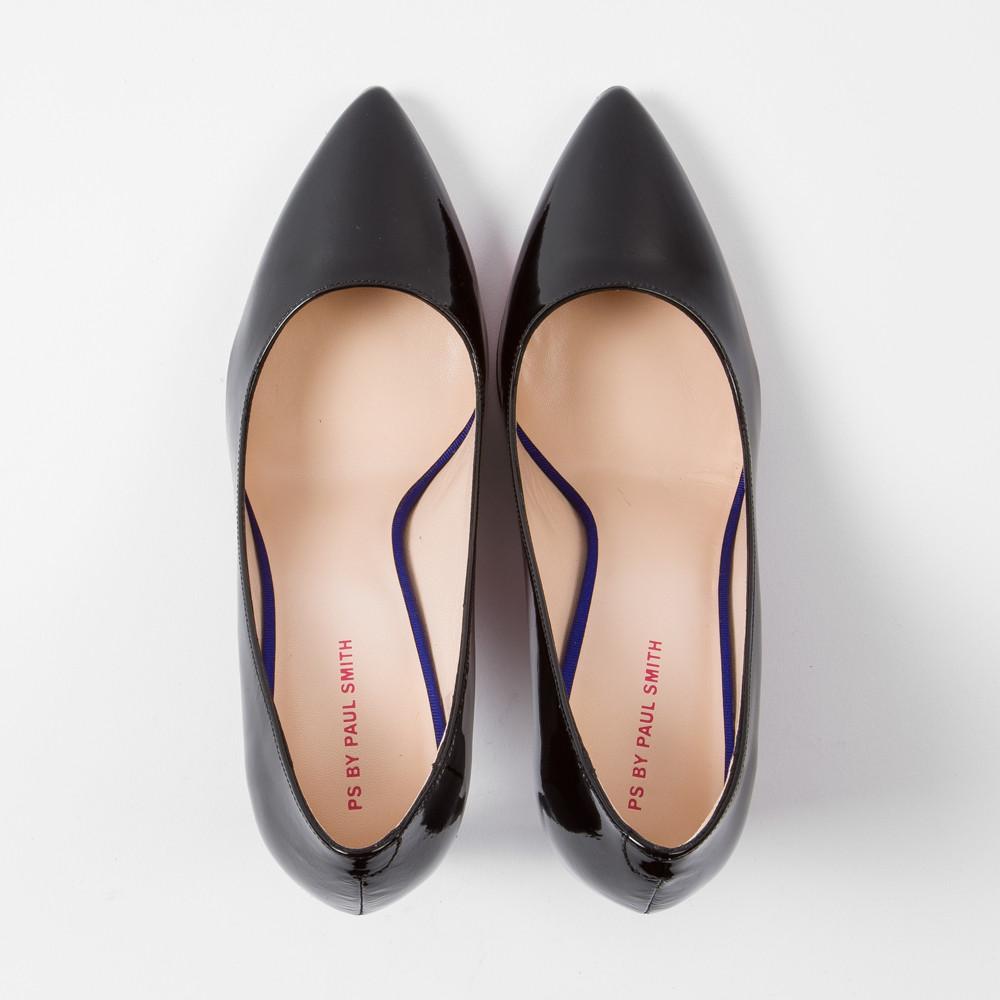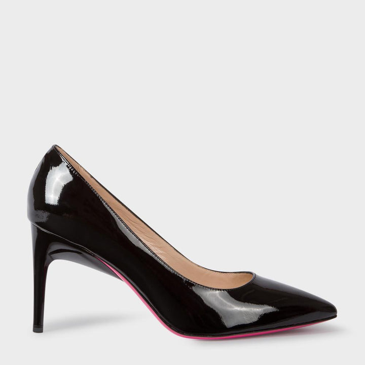 Crafted from smooth calf leather with a patent finish, these elegant black shoes feature 9cm stiletto heels.