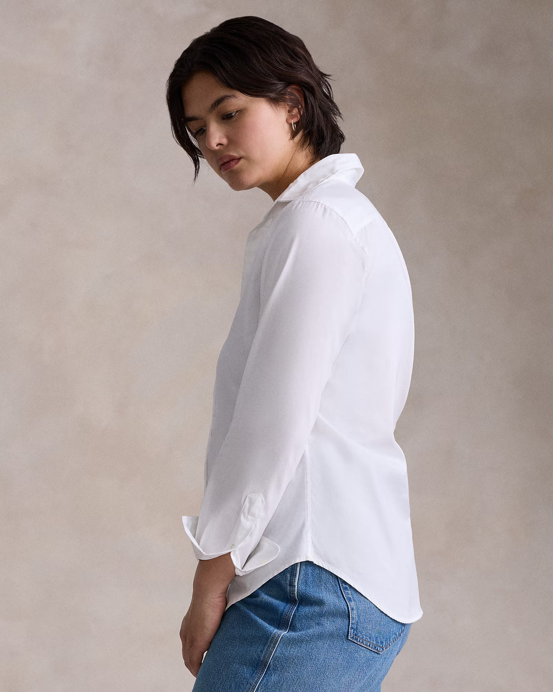 Point collar. Buttoned placket. Shell buttons.