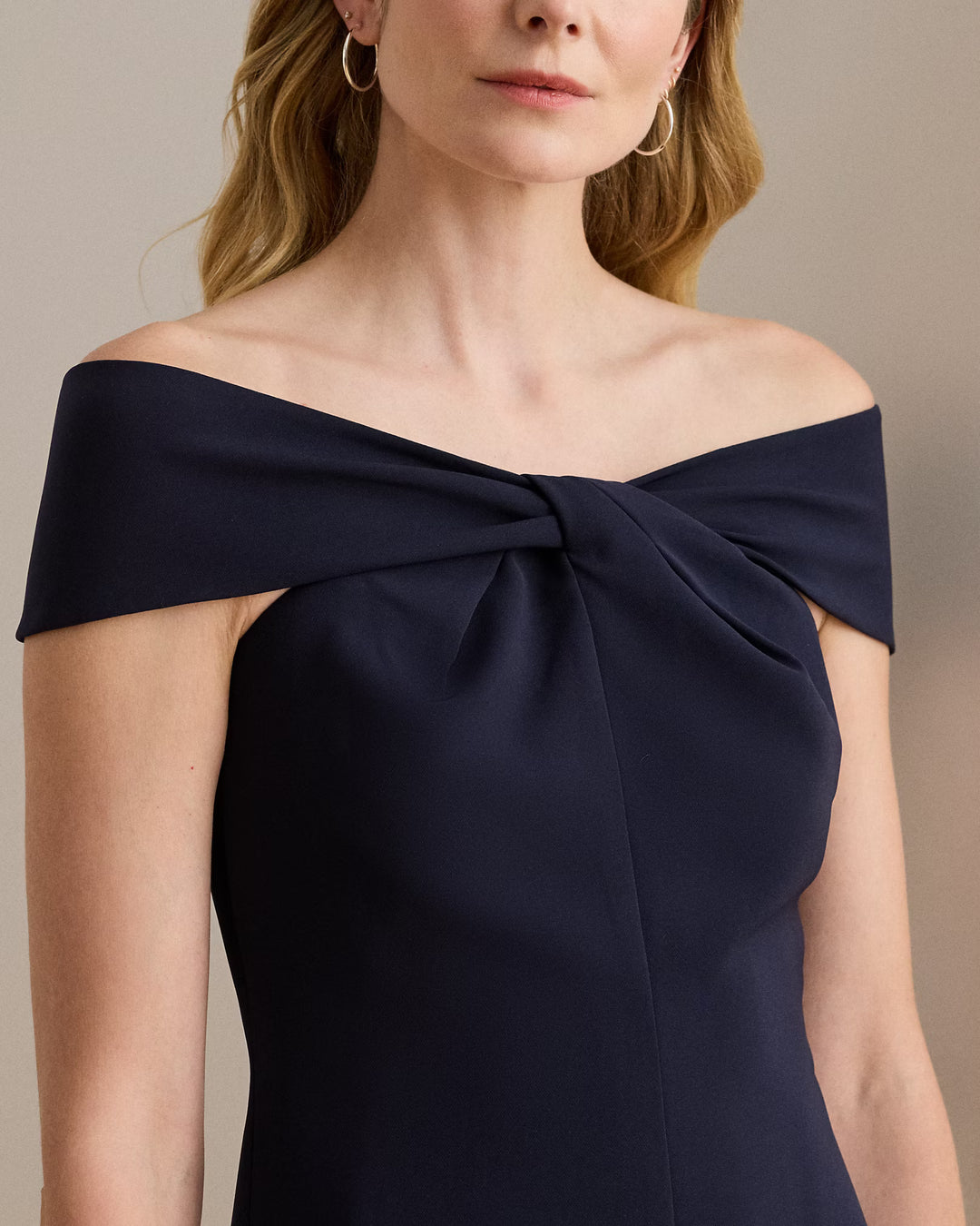 Distinguished by a twist-front off-the-shoulder neckline, this refined cocktail dress features a sheath silhouette crafted from smooth, stretch-infused crepe.