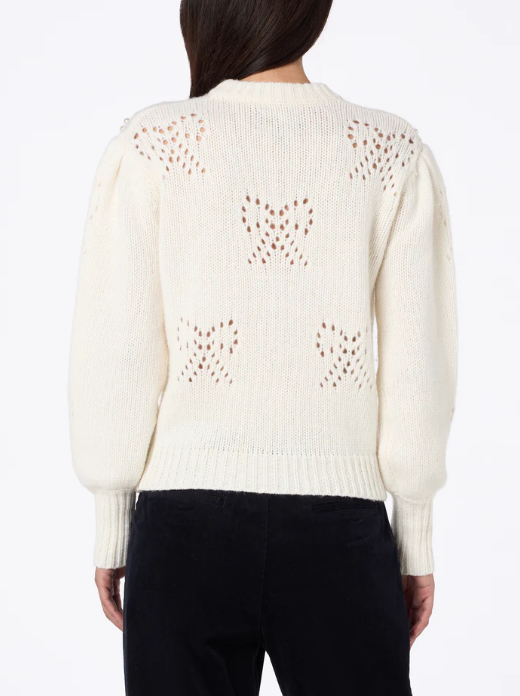 The Bloom sweater is a luxurious and feminine piece designed to elevate your wardrobe. Crafted from a soft and sumptuous wool blend, the standout feature of this sweater is the delicate embellishment of pearl-like beads, meticulously arranged to form elegant bow motifs. These sparkling accents create a sense of understated glamour and sophistication. Pair with your favorite jeans or trousers for a relaxed yet polished look.