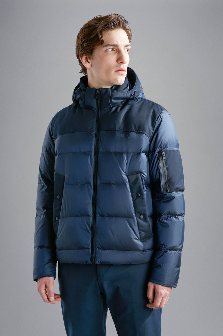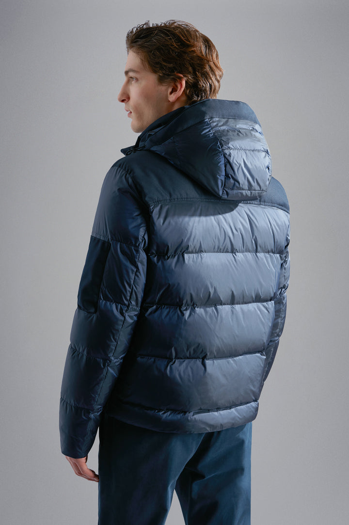 Hybrid down Jacket in iridescent nylon and Save the Sea technical fabric.