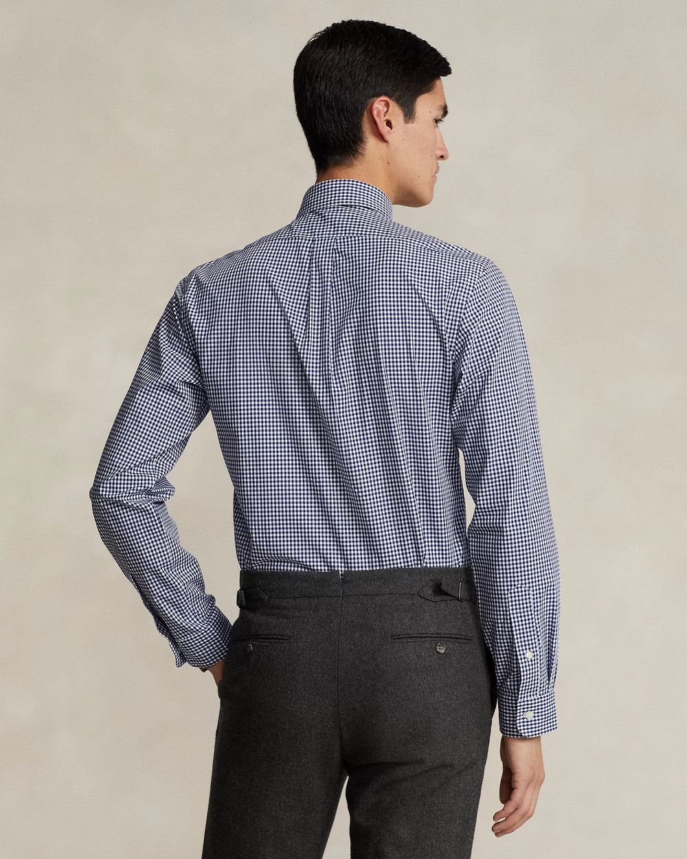 Custom Fit: a trim silhouette in between our Classic Fit and Slim Fit. Tailored through the waist.