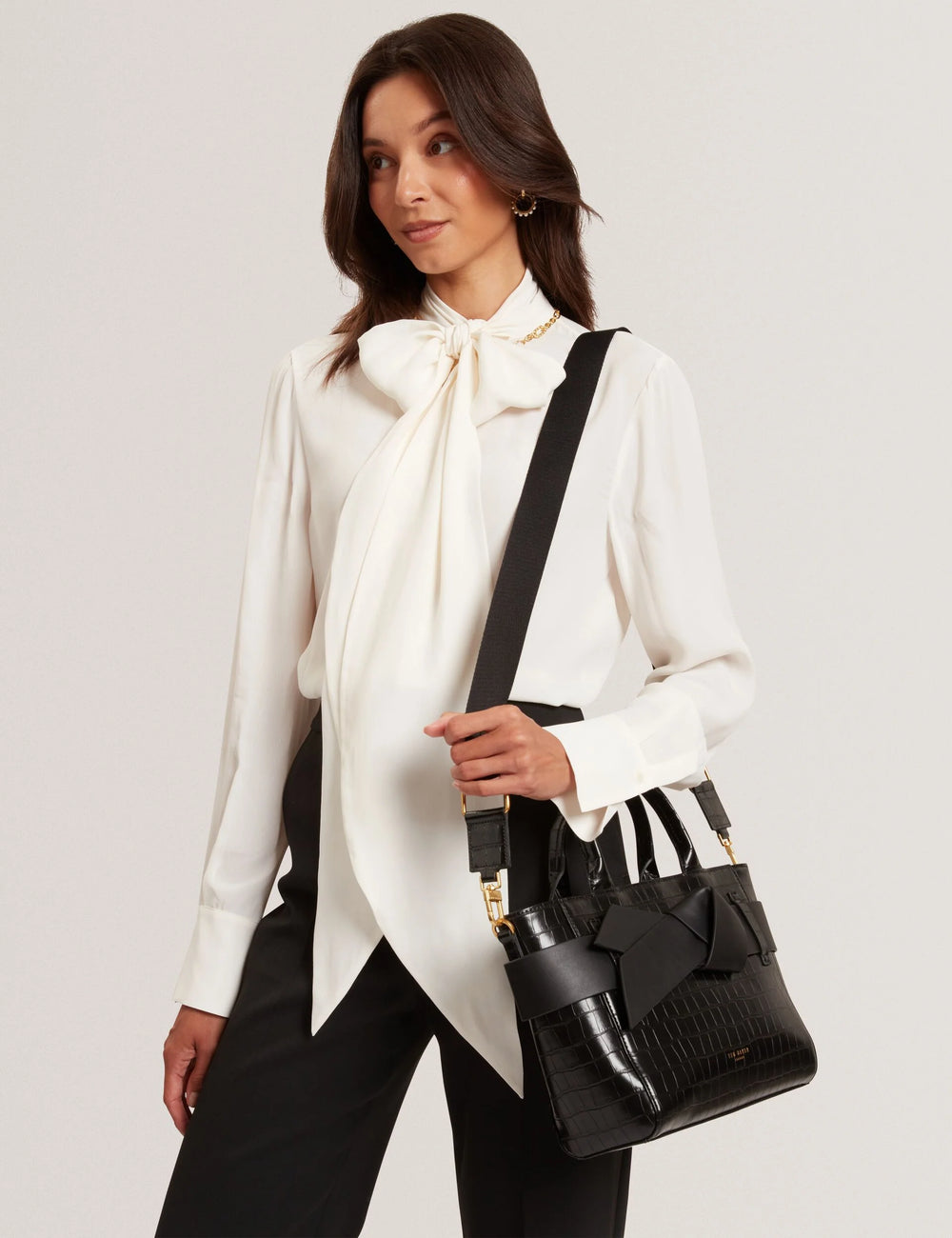 JJOSIA is the classy little tote bag that can do it all. A glossy croc texture outer is wrapped with an oversized bow trim, complete with a removable crossbody strap that takes it from daytime to date night.