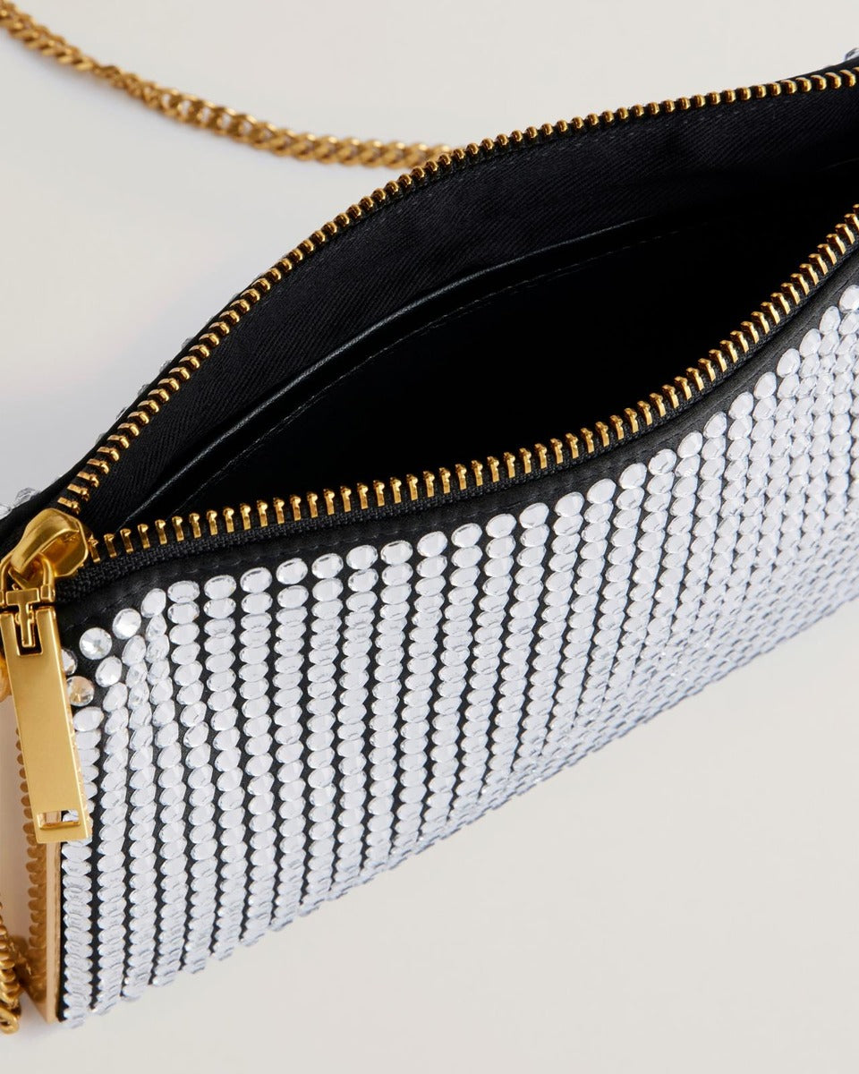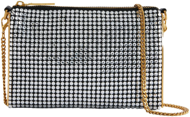 The small bag has golden plate decorations on the sides, the front and back have a crystal surface. Closes with a zipper, inside an open pocket. Detachable chain shoulder strap.