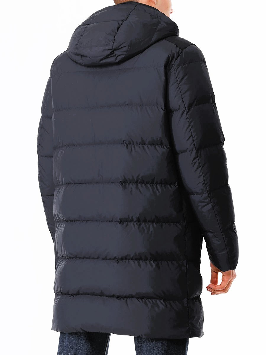 Black elongated quilted down jacket from PAUL&SHARK. - The fabric, created as part of the Save the Sea program, provides thermal insulation, waterproof and windproof properties, comfort and light weight, minimizing the negative impact on the environment. - A straight-cut model with long sleeves, welt and patch pockets, a high collar, a hood with a drawstring, a zip fastening and a windproof flap with buttons. - Thanks to the quilting, the filler is evenly distributed inside the product and retains heat better.