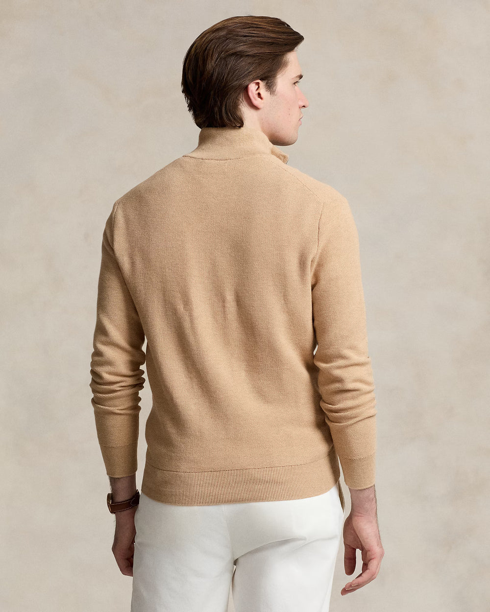 Rib-knit mockneck. Quarter-zip placket. Zip pull custom-developed with a "Polo" logo.
