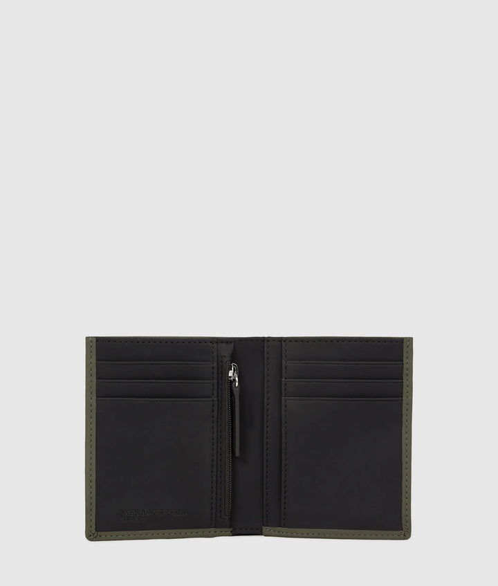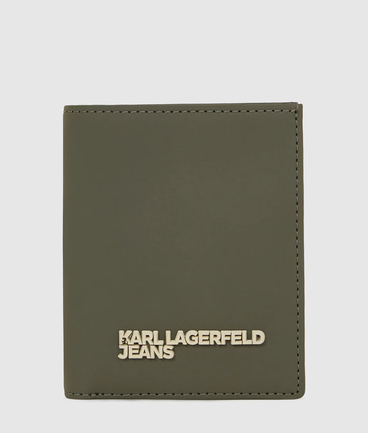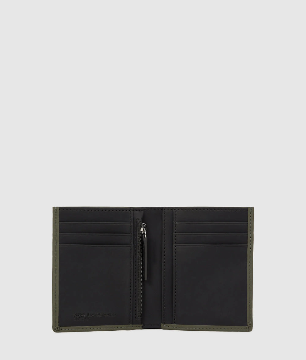Style and function collide in this sleek bifold wallet, with multiple card slots and a zipped coin purse. Made from coated technical leather, the bold KARL LAGERFELD JEANS logo anchors the piece.