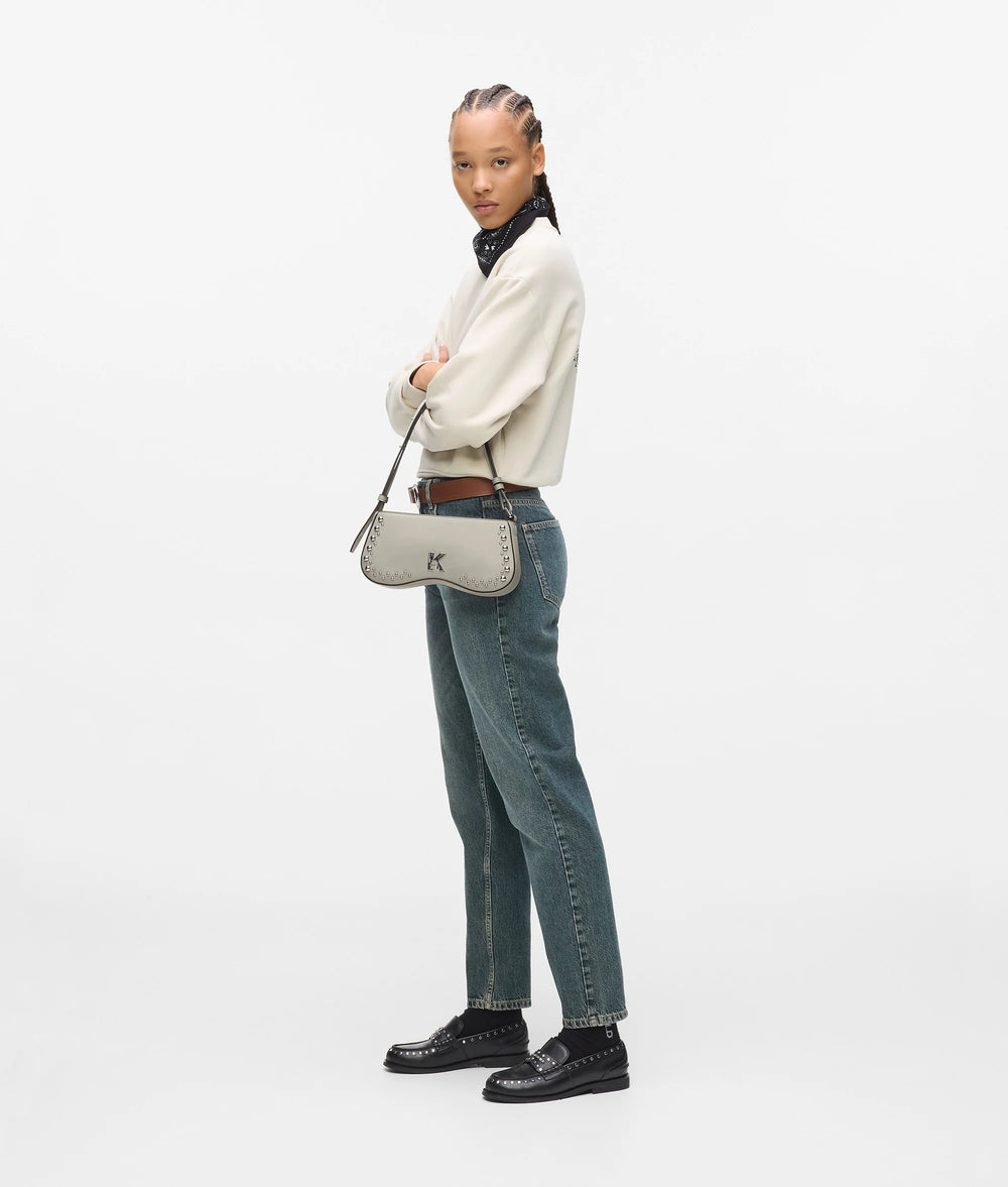 Add edge to any outfit with this statement shoulder bag, inspired by Karl Lagerfeld's iconic sunglasses. An adjustable strap ensures a comfortable fit, while bold studs and K-logo hardware bring a rock-chic feel.