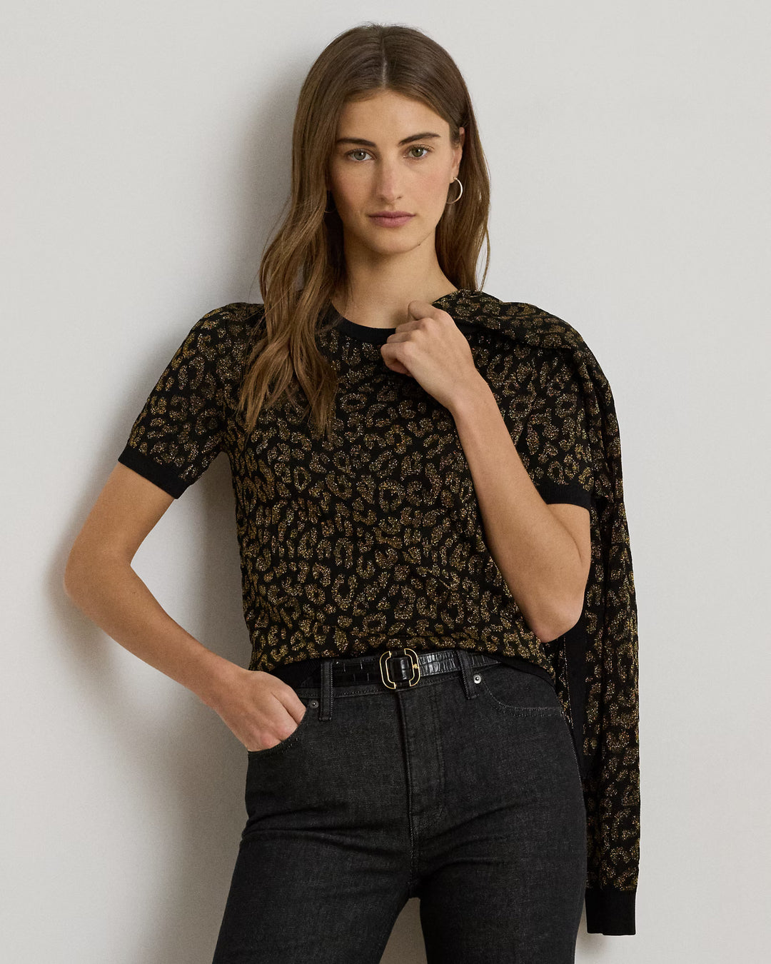 An eye-catching addition to your jumper collection, this short-sleeve crewneck style displays a metallic ocelot jacquard motif.