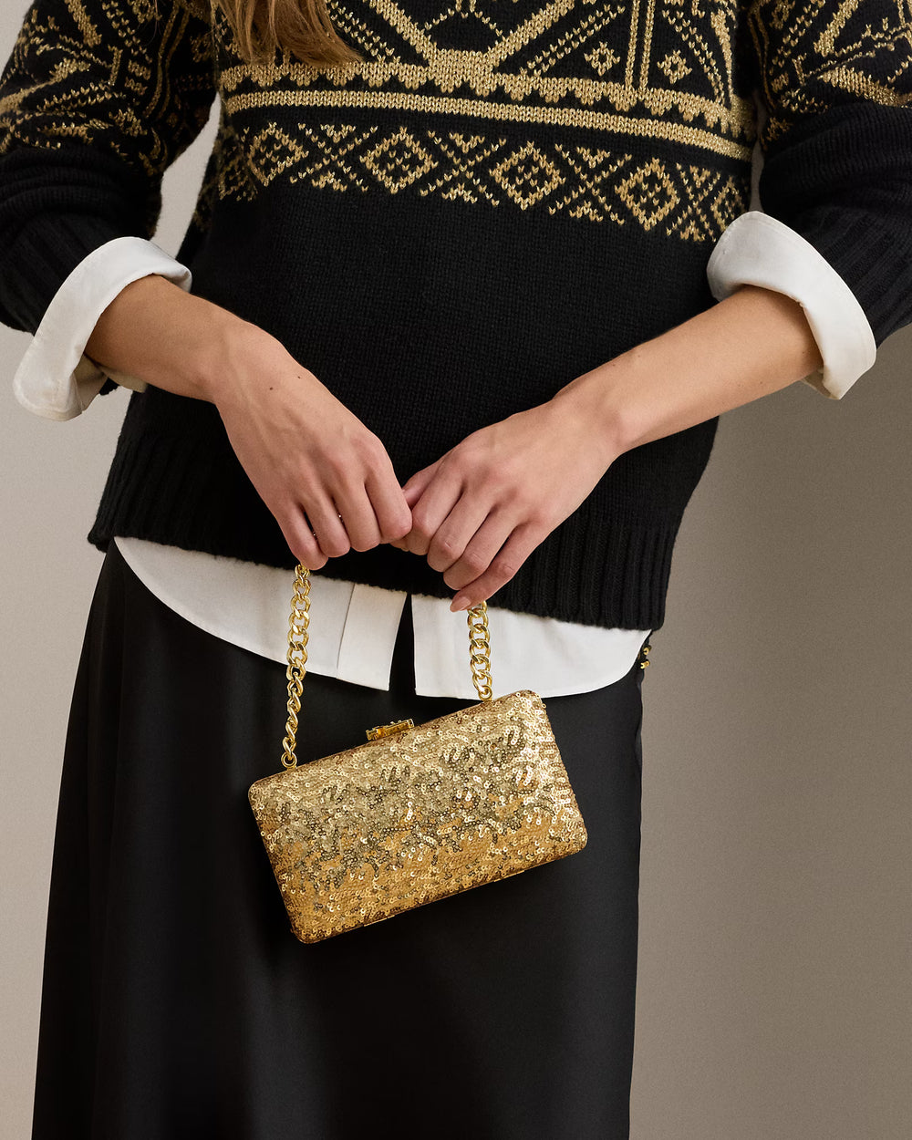 A glamorous addition to your accessories collection, this version of the Franki frame clutch is crafted with glistening sequins. Interior vents at each side of the bag provide secure storage for your necessities, while a convertible chain strap offers multiple styling options.