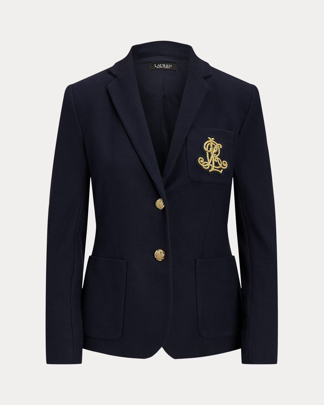 This chic jacquard blazer embodies Lauren style with a signature bullion patch on the chest and luxurious crest-embossed buttons.