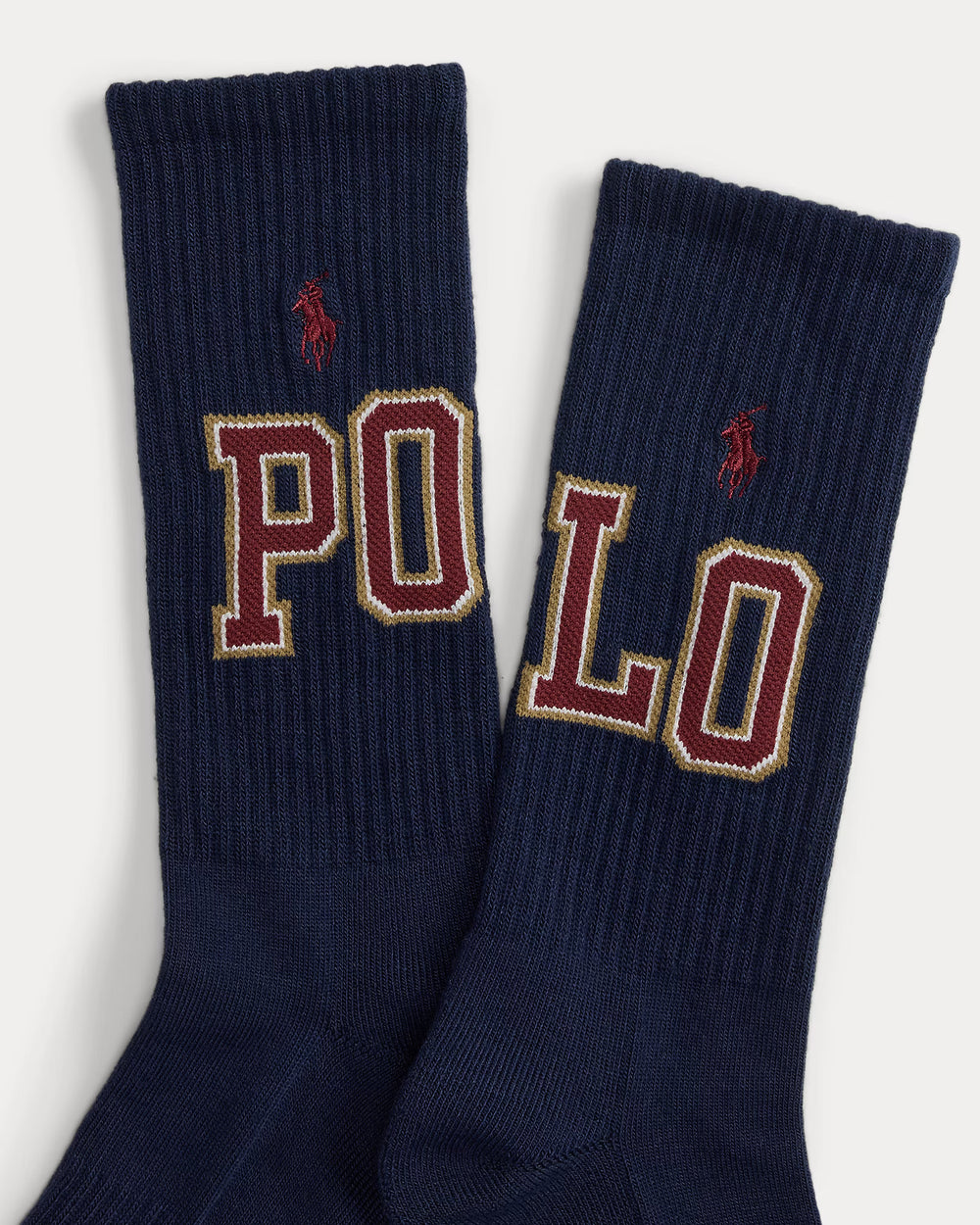 "Polo" knit on the back of the cuff of each sock. Signature embroidered Pony on the outer side of each sock.