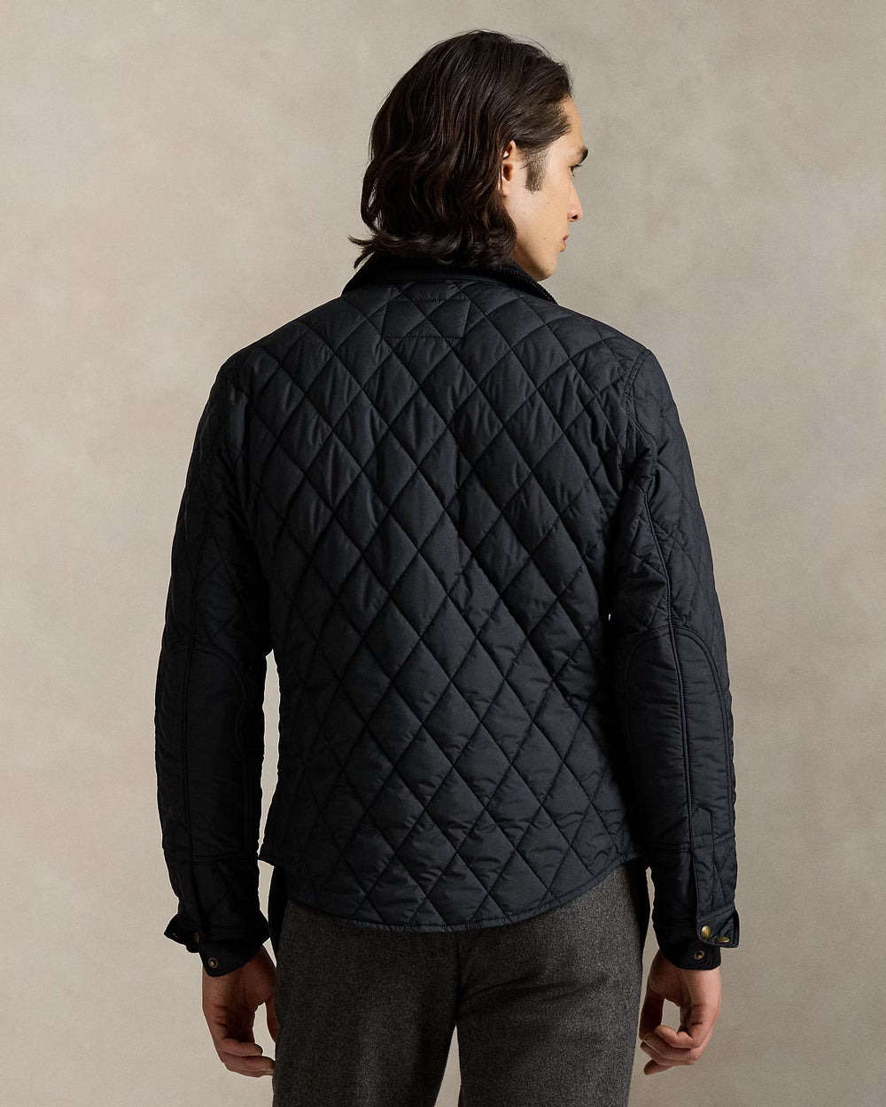 Straight collar with corduroy facing. Throat latch with a snapped closure. Snapped placket. Metal snaps custom-developed with a "Ralph Lauren" logo.
