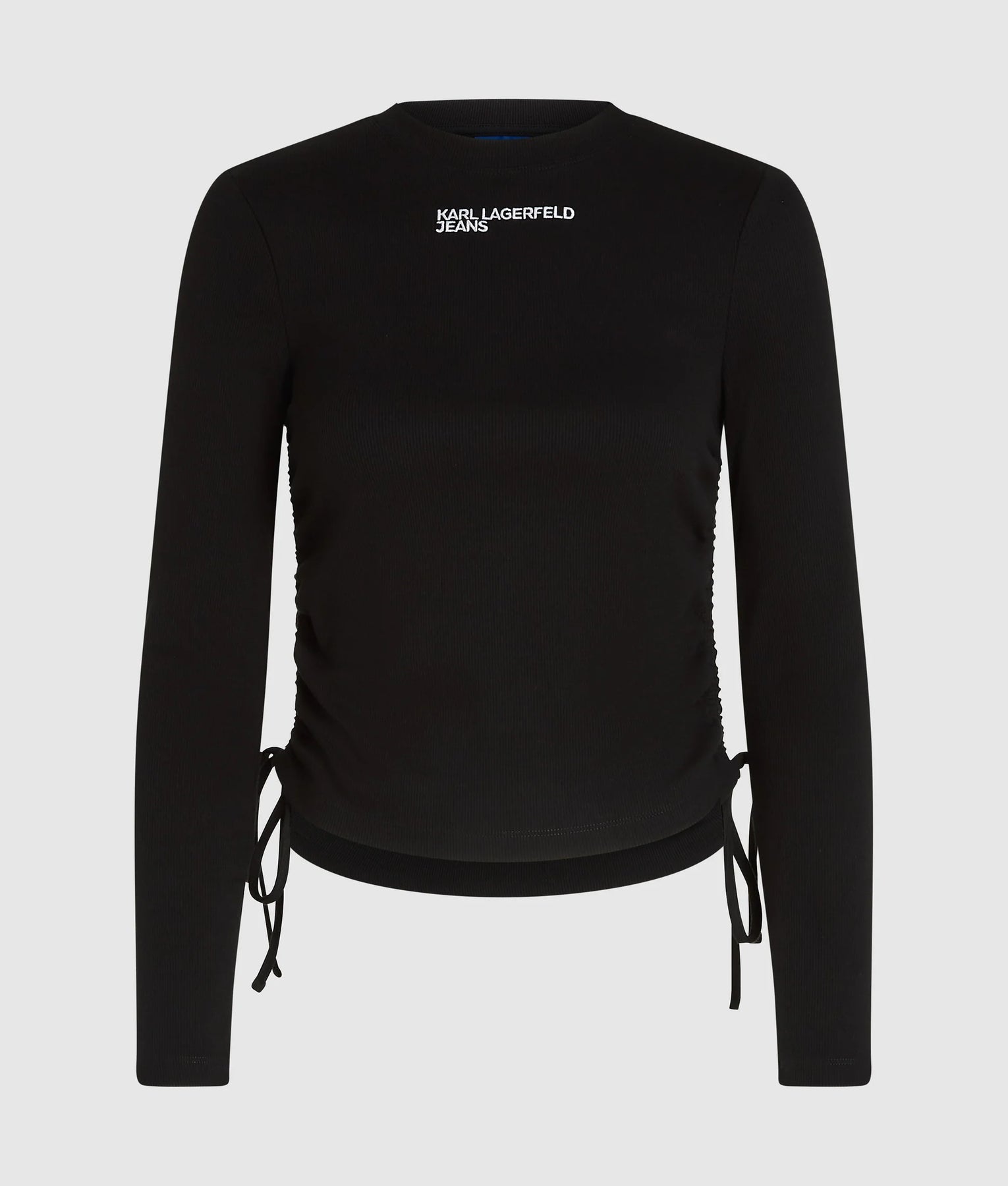 Soft organic cotton blend shapes this ruched ribbed top with subtle drawcords that sculpt the silhouette. The classic crew neck and delicate logo embroidery add effortless polish.