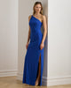 This body-skimming jersey gown is defined by its one-shoulder silhouette. Delicate ruching gathers at the waist for feminine definition, while a rhinestone-embellished chain-link detail on the shoulder strap adds a touch of glamour.