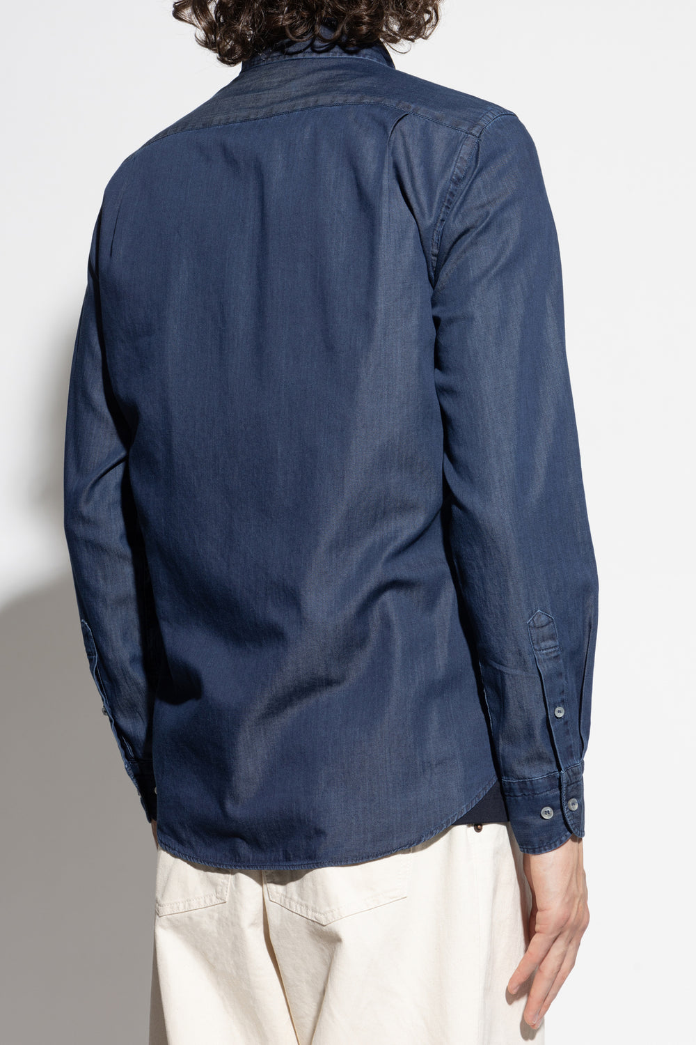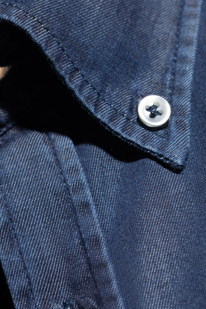 Its subtly tailored fit and rounded hem allow for versatile styling—both worn over trousers and tucked in. Exceptionally soft, smooth denim made from high-quality cotton guarantees outstanding comfort, while the subtle, delicate sheen of the fabric enhances the depth of color.
